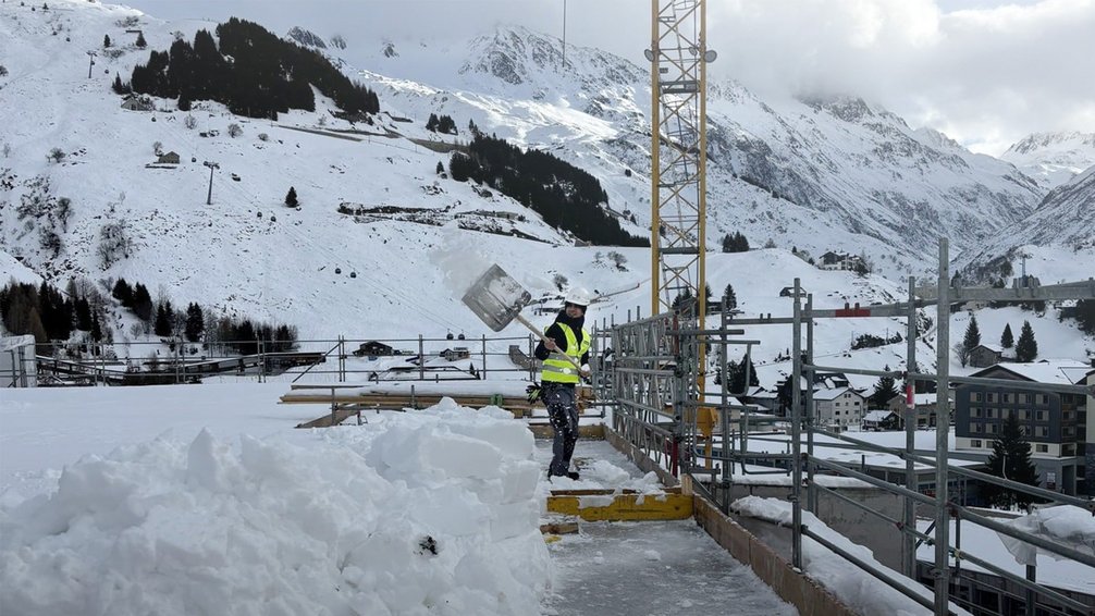 In the picturesque tourist resort of Andermatt, located at the northern foot of the famous Gemsstock in the Central Swiss Alps, "The Alpinist Andermatt" is a new top hotel with residences. Implenia is realizing the new building as total contractor for Andermatt Swiss Alps AG. At the end of last year, the building shell was raised to the sixth floor on schedule, with two more floors to follow by spring. Work continues even in snow and sub-zero temperatures. Up here, the average daily temperature in January is -9 degrees; this year it has already been -20 degrees.