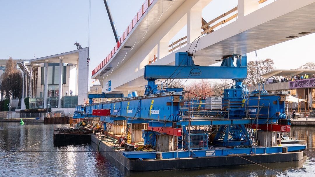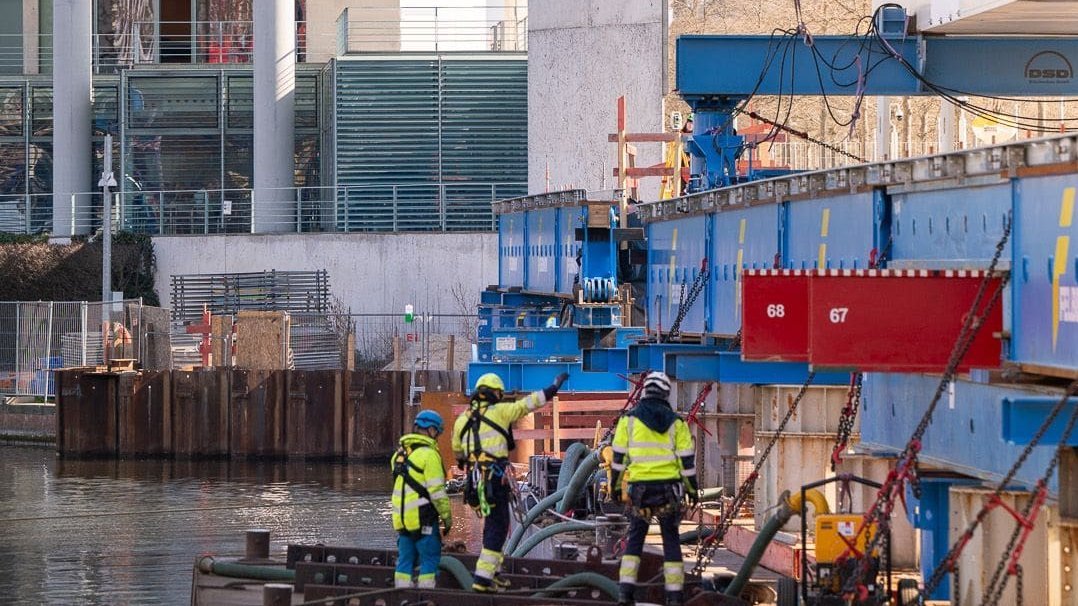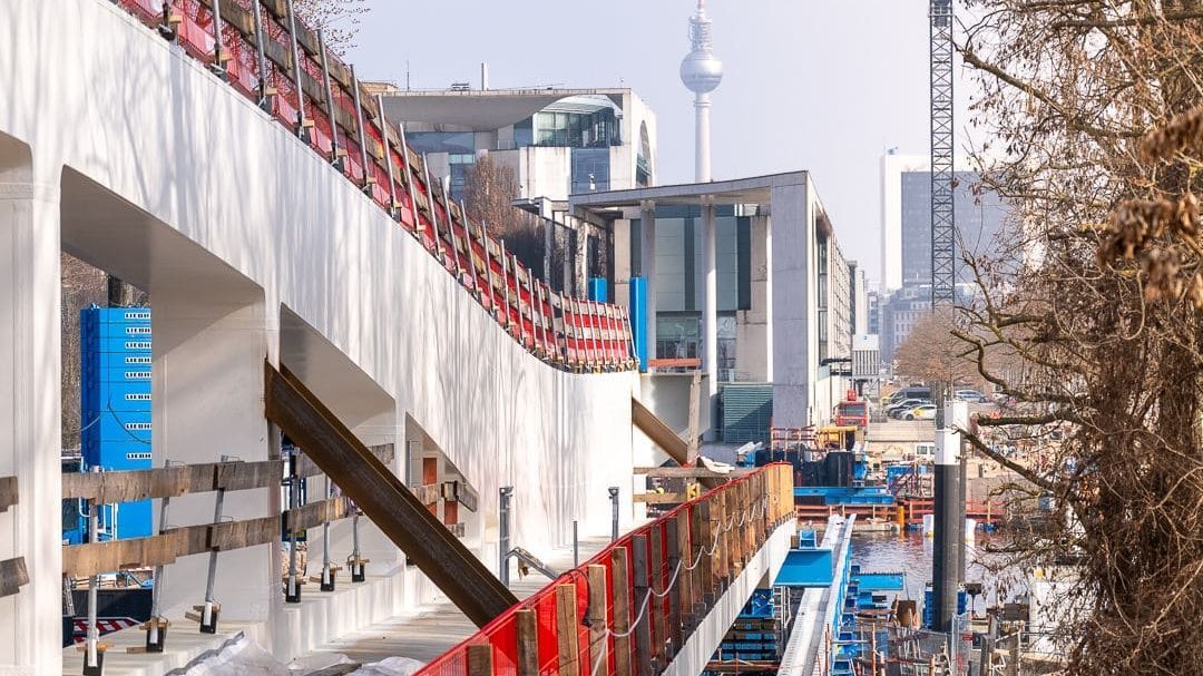 The extension of the Federal Chancellery continues to take shape with the shifting of the pre-assembled bridge structure over the Spree above the basement of the Federal Chancellery. The design and construction of the bridge are extremely challenging: the combination of security-relevant areas and a public cycle and pedestrian path across the Spree on two separate levels is a central design element.