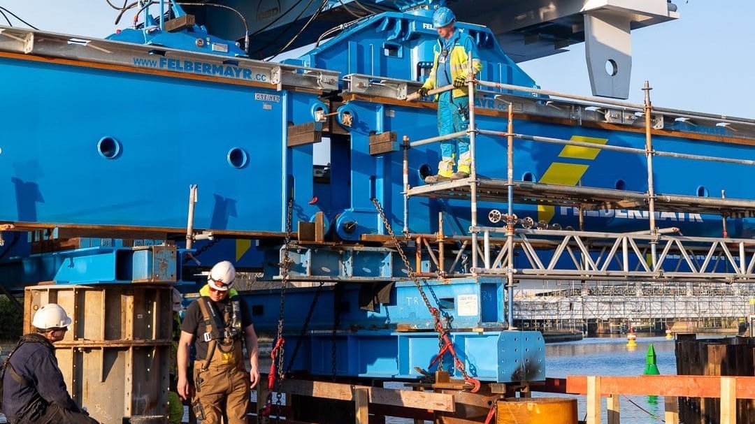 "Moving the finished bridge component in several stages, on land and on floating pontoons, is a masterstroke by all those involved in civil engineering," emphasizes senior site manager André Scherbatzki. "Now that the final position has been reached, the bridge still has to be stored. Due to the short edge spans of the bridge, there are lifting forces at the end points that still have to be transferred to the foundation."