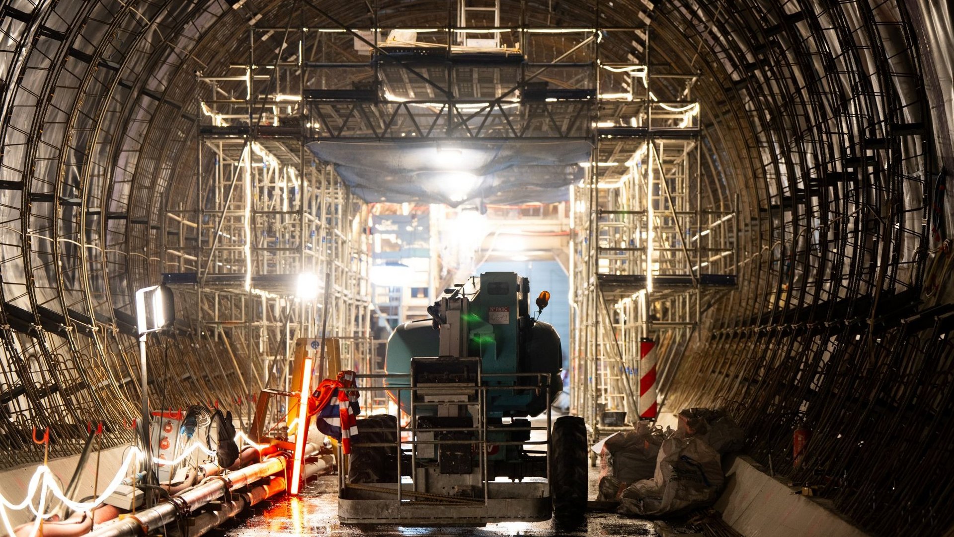Con l'aiuto del portale di rinforzo, i nostri dipendenti installano circa 10 tonnellate di armatura in acciaio, consentendo di rinforzare la galleria per 10 metri lineari. Questo processo impegnativo richiede un lavoro meticoloso: l'armatura in acciaio viene posizionata e legata interamente a mano.