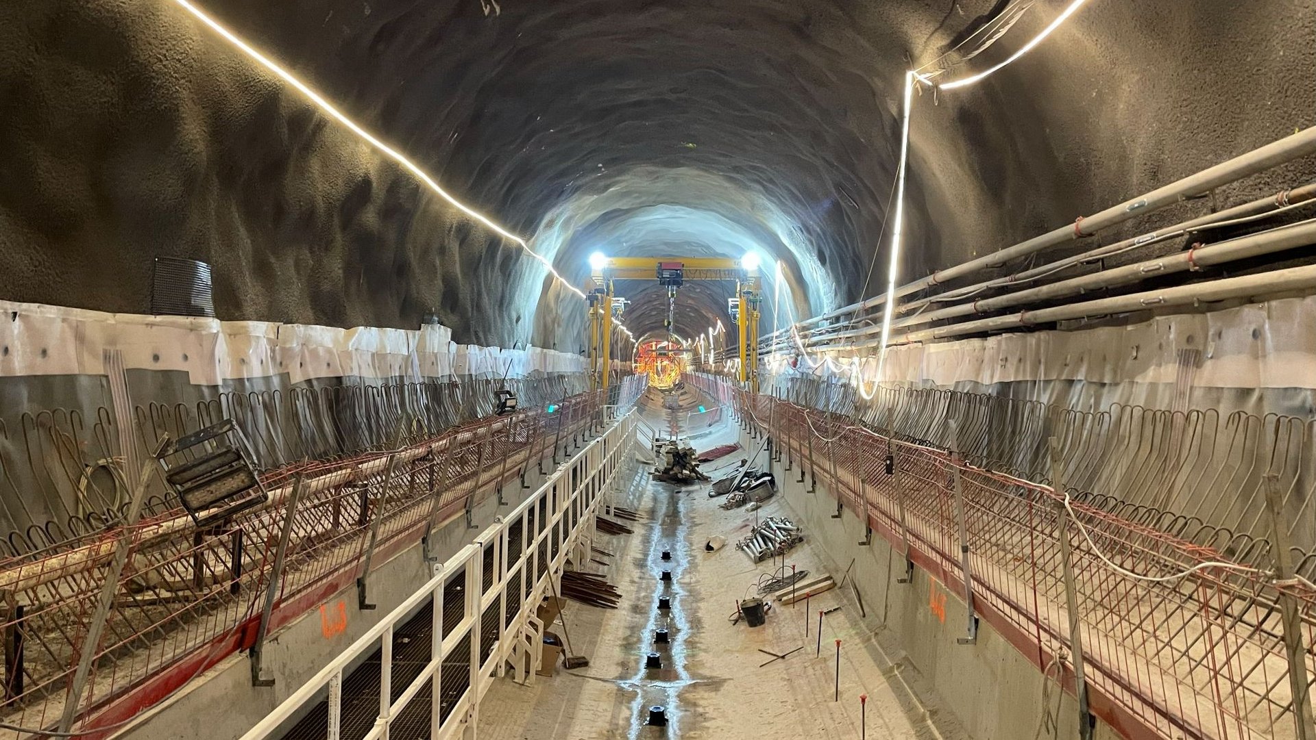 I lavori sono attualmente in corso sul binario sud (canna destra della galleria), mentre il binario nord (canna sinistra della galleria) è ancora utilizzato per la logistica dei lavori di scavo della galleria, che proseguono in parallelo. In una fase successiva, tutte le attrezzature di casseratura saranno raddoppiate per continuare il rivestimento in entrambe le canne.